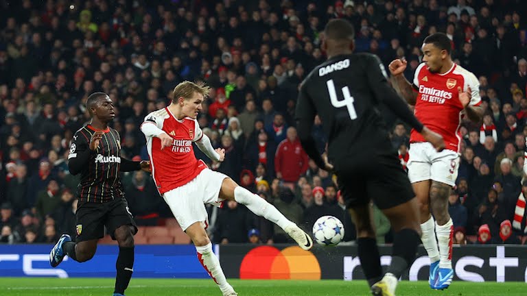Au retour des vestiaires, Haise mettait à l’abri ses joueurs sous le coup d’une possible suspension (Sotoca, Abdul Samed et Medina) et lançait Thomasson, El Aynaoui et Machado. Le match s’équilibrait, mais la maîtrise technique restait du côté d’Arsenal. Le RC Lens avait au moins le mérite d’avoir haussé le curseur dans l’engagement, et semblait capable de sortir de la deuxième période sans encaisser de but. Mais c’était sans compter l’arbitre qui sifflait un penalty pour une main de Khusanov, jusque-là auteur d’une entrée intéressante. Jorginho, lui aussi entré en jeu, aggravait donc le score en prenant Samba à contrepied (6-0, 86e). Une véritable déroute pour les Lensois, qui ont pu voir de près le très haut niveau européen. À eux de se relever pour aller arracher la 3e place du groupe et une qualification en Ligue Europa lors de la dernière journée, avec la réception du FC Séville.