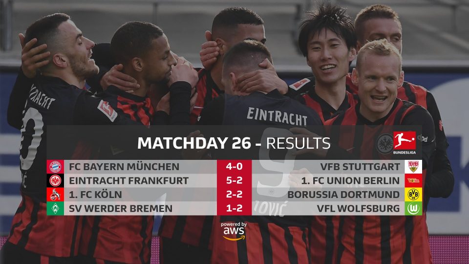 Dans les autres rencontres, Werder Brême a chuté à domicile contre Wolfsbourg  (2-1), Francfort a cartonné Union Berlin  (5-2), et le Borussia Dortmund a été tenu en échec par Cologne  (2-2) malgré le doublé Erling Haaland.