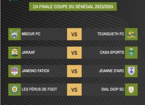 D’autre part, le tirage au sort a fait qu’un club de division régionale se retrouvera forcément dans le carré d’as en raison du match ACA Les Férus – Dial Diop SC, deux équipes qui se font un nom à force de travail et d’abnégation. Les deux autres affiches sont Jamono-Jeanne d’Arc et Mbour PC-Teungueth FC. En demi-finale, le vainqueur de Jaraaf-Casa fera face au sortant de Férus Foot – Dial Diop tandis que le vainqueur de Jamono-JA jouera contre celui de Mbour PC-Teungueth FC.