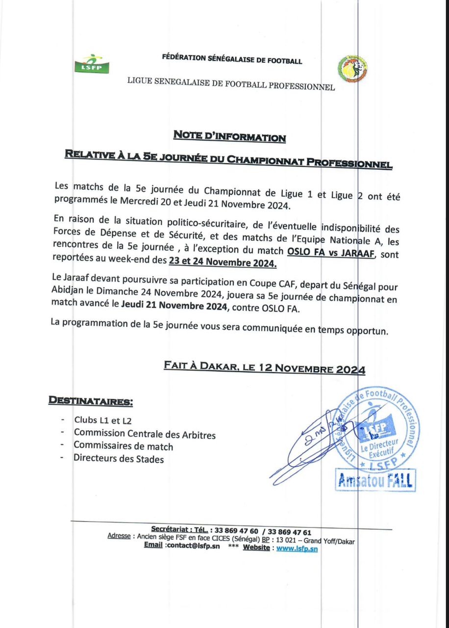 En raison de la situation politico-sécuritaire du pays et du match de l’équipe nationale A du Sénégal contre le Burundi le 19 novembre, les matches de la 5e journée des Ligues 1 et 2 ont été reportés au week-end du 23 au 24 novembre.